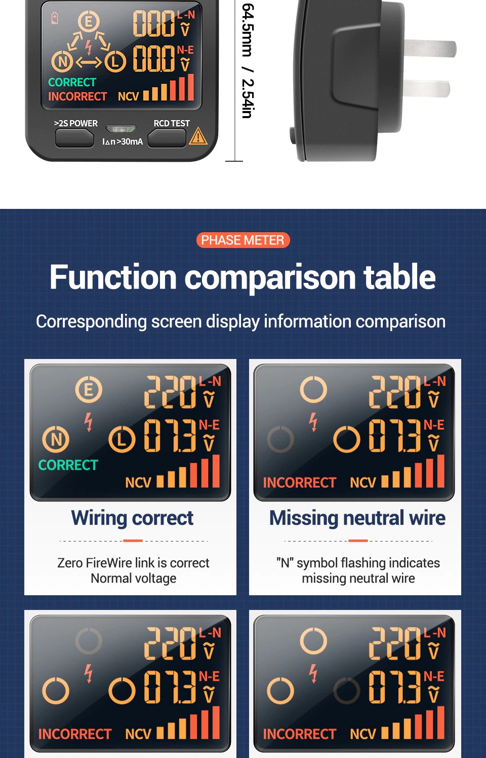 Ele pode detectar rapidamente e com precisão o status da conexão do soquete ao mesmo tempo: inclui 7 padrões diferentes para você ler: correto/terreno aberto/neutro aberto/ao vivo/neu reverso/ao vivo/grd reverso/ao vivo aberto/terreno ao vivo reverso faltando terra.