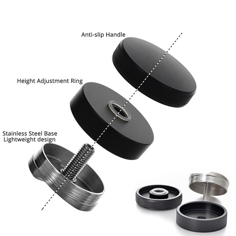 Height is adjustable by it's screw mechanism (no grub screws ,shims, or allen keys required) to suit different doses or baskets, you can set your desired tamping depth for consistent tamping pressure every time.