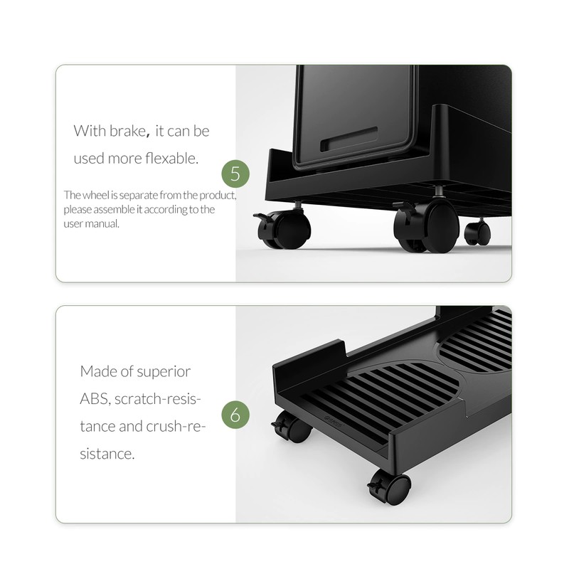 Este suporte de computador permite que você eleve e ventile adequadamente sua torre de computador, para manter a poeira e umidade fora do chão e proteger o computador e o próprio suporte. Enquanto isso, este suporte caracteriza quatro rodízios omnidirecionais para o movimento liso e a colocação conveniente.