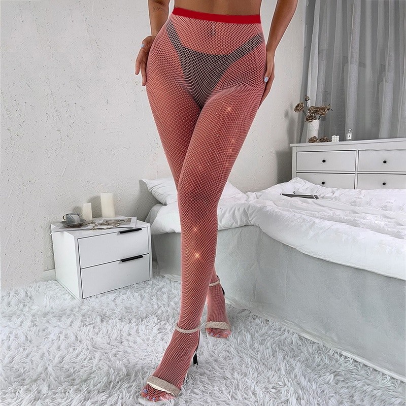 Calças Eróticas Strass Retalhos Sexy Feminino Oco Para Fora Fishnet Preto Leggings Calças Clubwear Lápis Calças Mais recentes