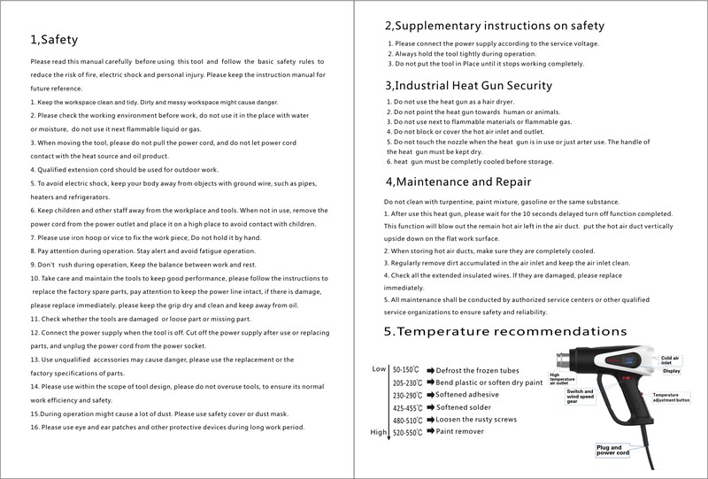 Alta qualidade e seguro: tem boa resistência à temperatura. nosso produto também tem a função de proteção de alta temperatura, a pistola de calor vai parar de trabalhar quando a temperatura é muito alta, e o cabo de alimentação passou a certificação de segurança ul, que pode mantê-lo seguro ao usar.