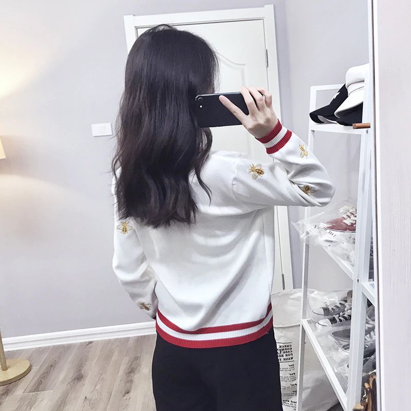 Alta Qualidade Designer De Moda Abelha Bordado Cardigan Manga Longa Único Breasted contraste Cor Botão Malha Blusas C-196