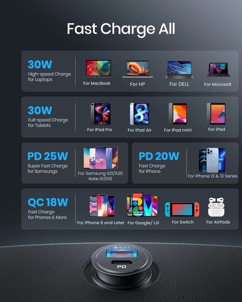 Recurso 2: Carregador Rápido de Carro Dual Port PD; Carregamento rápido