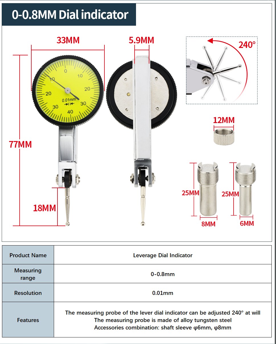 Características: a sonda de medição do indicador de discagem da alavanca pode ser ajustada 240 ° à vontade. A sonda de medição é feita de liga de aço de tungstênio. Combinação de acessórios: manga de eixo 66mm, 88mm.