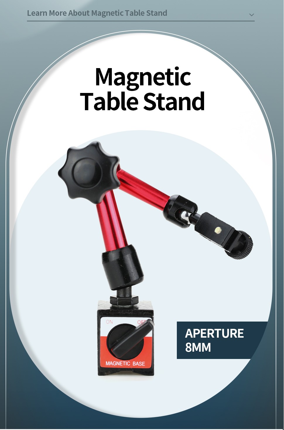 Características: suporte magnético poderoso da base com interruptor do ímã. A junção giratória flexível e resistente pode ajustar a direção e a posição arbitrariamente. A base do v-sulco pode ser instalada em uma superfície cilíndrica.