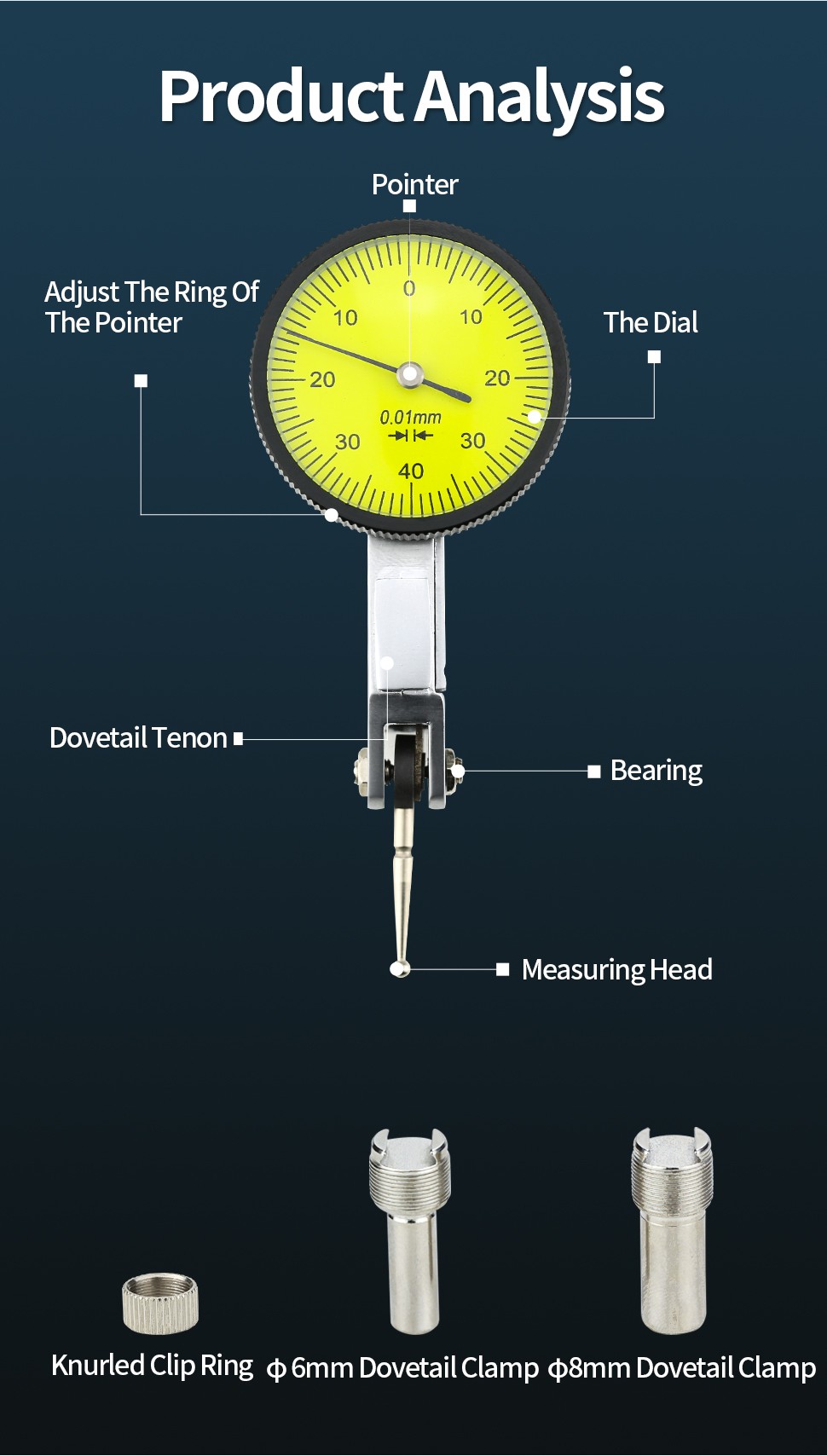 Características: a precisão do indicador de discagem é de 0.01mm, o que pode medir com mais precisão a concentricidade do corpo principal. A escala é clara, e a leitura é intuitiva e conveniente. Sonda de medição de aço inoxidável de alta qualidade, à prova de ferrugem e resistente ao desgaste.