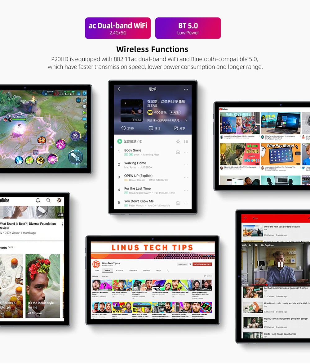 P20hd é equipado com 802.11ac wifi de banda dupla e bt5.0, que têm velocidade de transmissão mais rápida, menor consumo de energia e maior alcance.