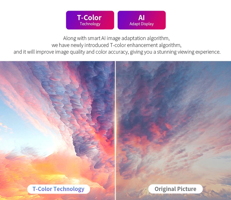 Juntamente com o algoritmo inteligente da adaptação da imagem de ia, nós introduzimos recentemente o algoritmo do realce da t-cor, e ele melhorará a qualidade da imagem e a precisão da cor, dando-lhe uma experiência de visualização impressionante.