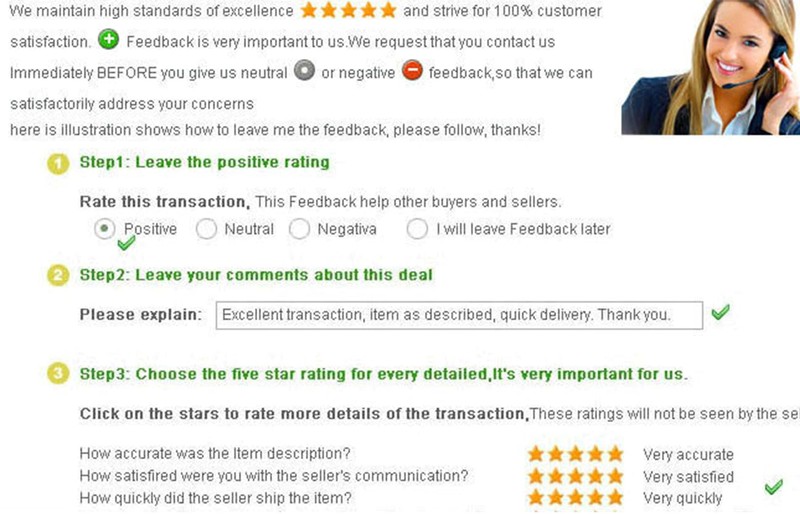 Se você estiver satisfeito com nossos produtos, por favor tire um minuto para deixar um feedback positivo e nos dar uma classificação de 5 estrelas.