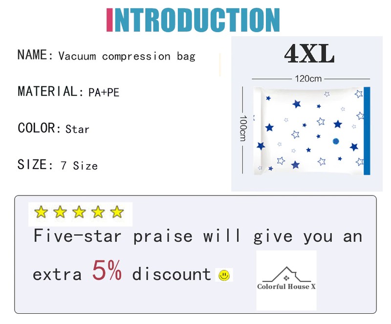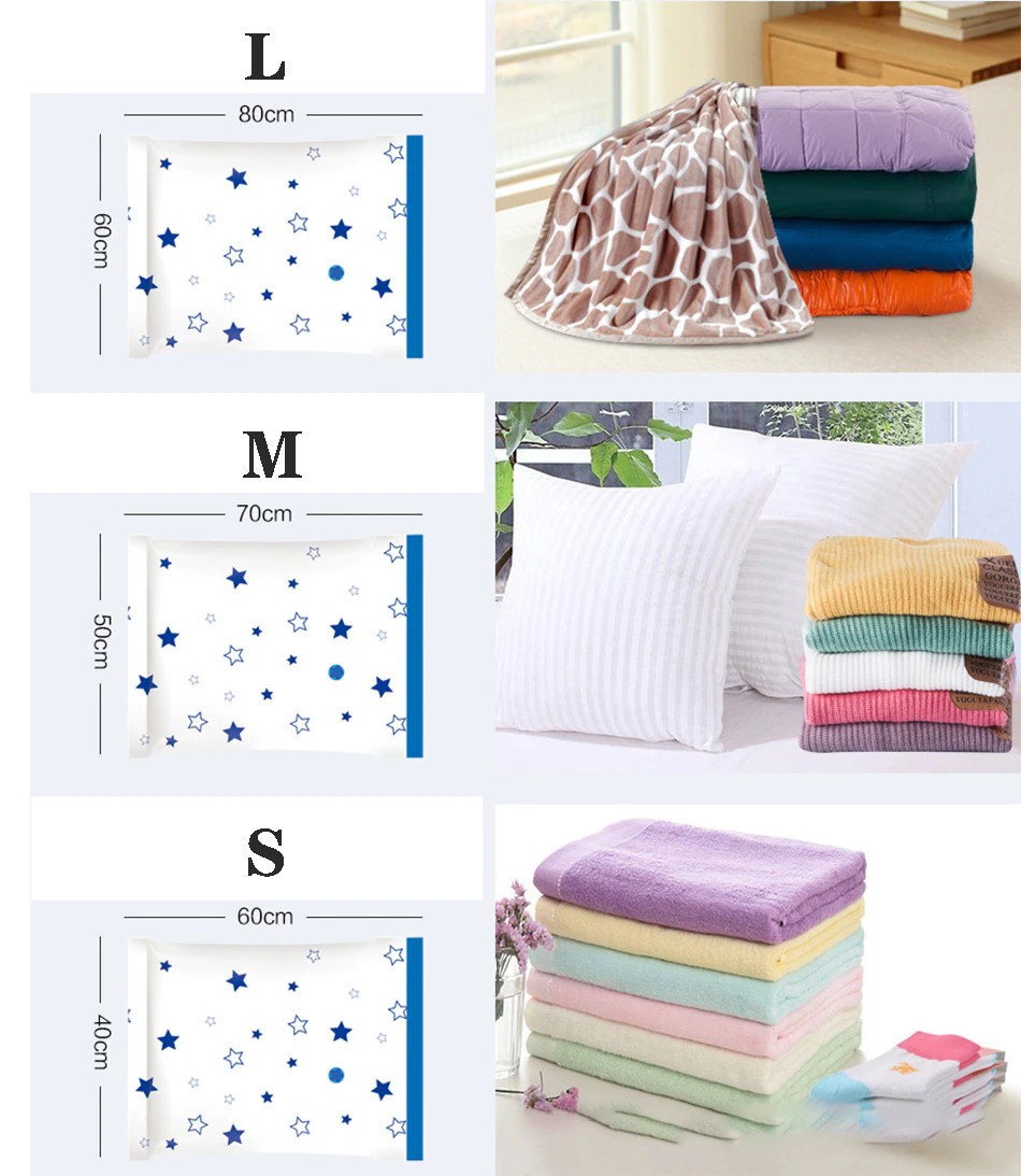 Nome: saco de compressão a vácuo Material: pa pe pet Cor: estrela Tamanho: sete tamanhos Função: dobrável, grande capacidade, à prova de umidade, à prova de poeira, à prova de insetos, à prova de mofo, economia de espaço, supercarga, macio e resistente ao desgaste, sem odor, simples e elegante, fácil de armazenar, design a vácuo, padrão bonito, espaço de armazenamento elegante e bom ajudante Cenários aplicáveis: quarto, sala de estar, escritório, etc.