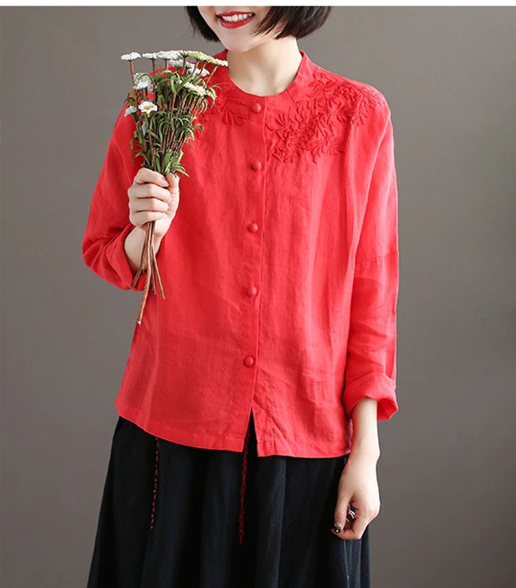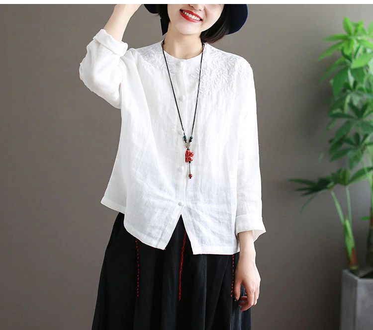 Camisa Feminina De Linho Com Botão E Manga Longa, Camisa Vintage Bordada De Algodão, 4Xl Plus Size Blusa Feminina Gola Redonda Casual, Branca