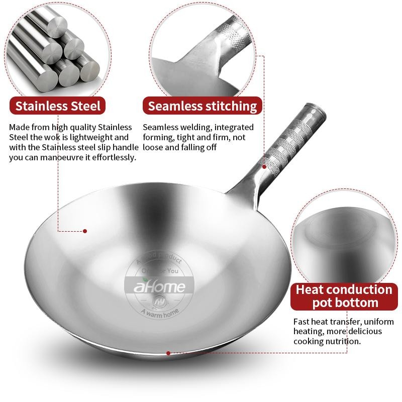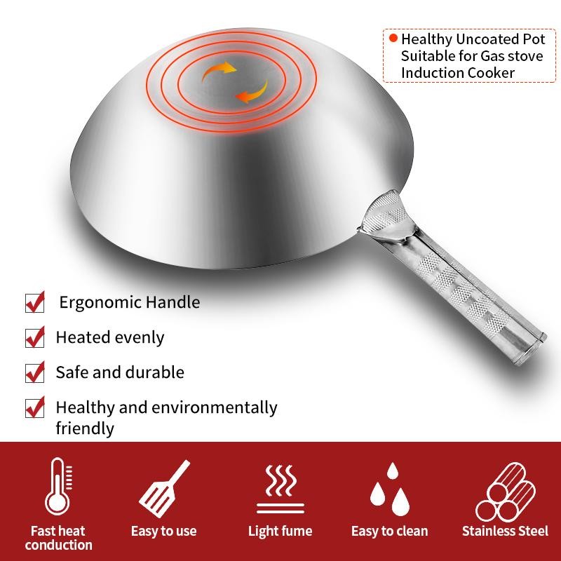Aço Inoxidável Wok 1.8Mm Grosso De Alta Qualidade Chinês Artesanal Wok Tradicional Cozinha Antiaderente Gás Wok Pan Cozinhar