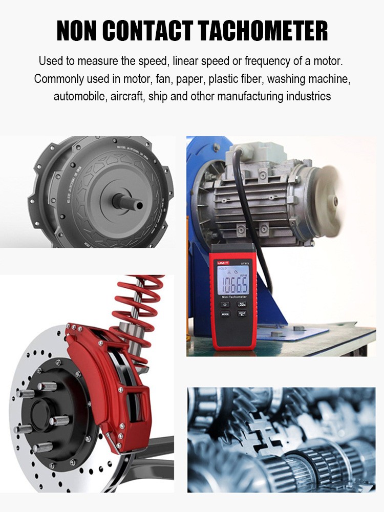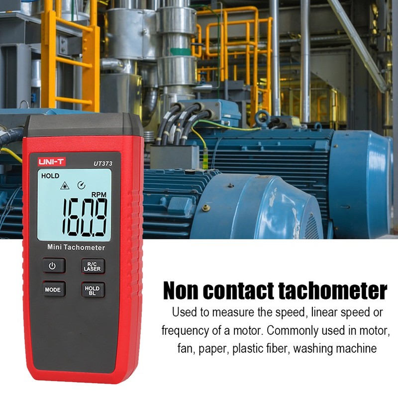 Ut373 é um tacômetro digital confiável do não-contato usado para medir a velocidade de rotação dos motores e de outras máquinas. Ut373 é capaz de medir com segurança objetos rotatórios através de um método não-intrusivo.