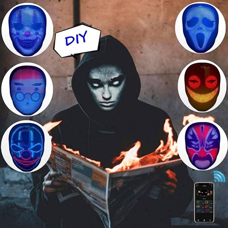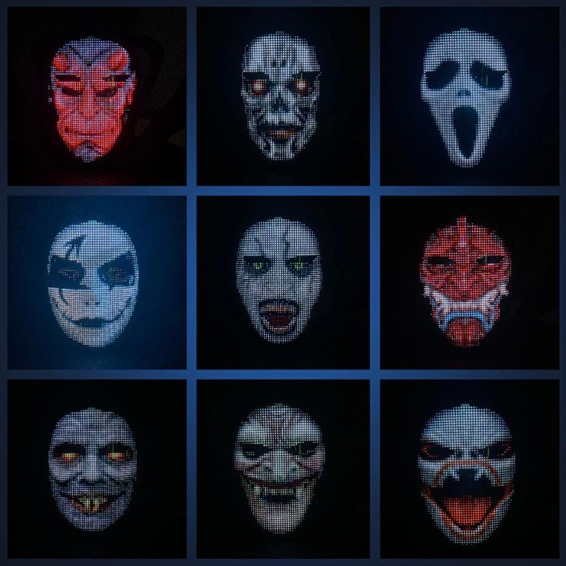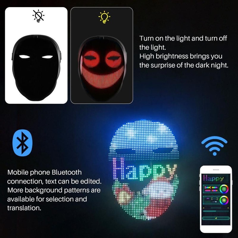 1. led face-changing light-emitting face cover: a capa de rosto de exibição a cores completa adota um design único e tem quatro modos de exibição: edição de texto, graffiti diy, animação padrão e ritmo de música. Você pode se conectar ao seu telefone com um escudo led piscando através do aplicativo bluetooth e, em seguida, se destacar em qualquer festa ou festival.