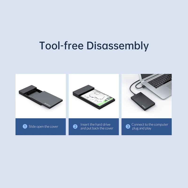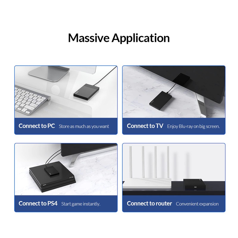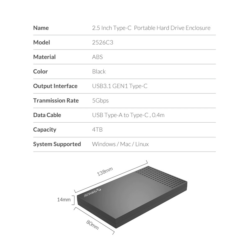 Корпус жесткого диска ORICO поддерживает системы Windows / mac / Linux. Предназначен для 7 мм/9,5 мм 2,5 дюймовых жестких дисков, а также поддерживаются sd-карты 4 ТБ. Подходит для жестких дисков SATA, таких как WD, Seagate, Toshiba, Hitachi, Samsung, Crucial, SanDisk и т. Д. И может использоваться для компьютеров, телевизоров, умных роутеров, PS4, XBOX и других устройств.