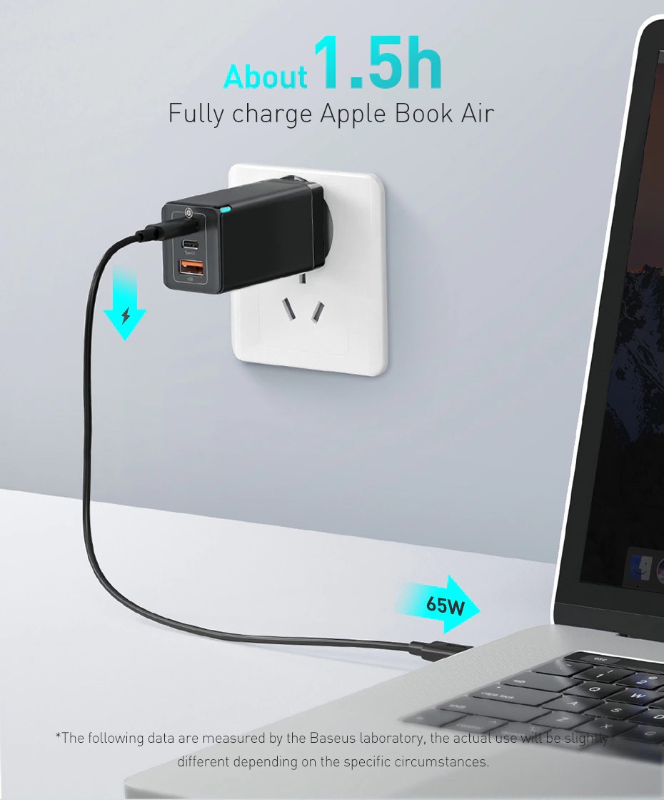 Он принимает BPS II зарядки технологии и Baseus охлаждения технологии с двумя 65W быстро заряжания портов, более высокую мощность, меньший объем и более низкий рост температуры
