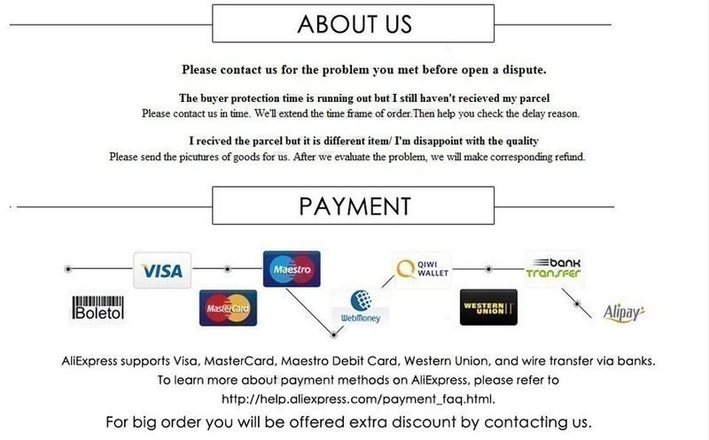 Способ оплаты 1. Существует множество способов оплаты на Adafar, таких как Alipay, кредитные карты, банковские переводы в реальном времени, офлайн-платежи (банковские переводы и Western Union). Вы можете выбрать наиболее удобный для Вас способ. Для защиты ваших интересов оплата будет временно задержана компанией Alibaba и не будет передана нам, пока вы не получите заказ и не подтвердите, что остались им довольны. Доставка 1. Когда мы получили информацию о вашем заказе и оплате, мы обычно 2-5 дней для завершения доставки, мы предоставляем информацию для отслеживания логистики. Однако из-за определенных факторов и региональных проблем, которые могут привести к задержке доставки, надеемся на понимание, время доставки обычно составляет 15-40 дней, пожалуйста, будьте терпеливы. 2. Если вам нужен более быстрый способ доставки, вы можете выбрать другие способы, пожалуйста, свяжитесь с нами. 3. Мы не несем ответственности за любые таможенные пошлины или налог на импорт. 4. Заказ будет отправлен в вашу руку транспортной компанией в течение срока доставки, соответствующего списку услуг доставки ниже. Если вы не получили посылка в течение срока доставки, пожалуйста, свяжитесь с нами, и мы ответим Вам в течение 24 часов. Политика Возврата 1. Мы полностью гарантируем наши товары. Все товары находятся в совершенно новом состоянии, если не указано иное в другом месте в описании. 2. Все возвраты-Бракованные или иные-должны быть предварительно разрешены. Пожалуйста, свяжитесь с нами, чтобы получить разрешение и обратный адрес, прежде чем отправить товар обратно. 3. Во всех случаях покупатели оплачивают стоимость доставки за свой счет, чтобы вернуть товары для обмена или возврата денег. Мы будем нести ответственность за почтовые расходы по замене. Свяжитесь с нами 1. Если у вас есть какие-либо вопросы, пожалуйста, свяжитесь с нами, мы ответим на ваши вопросы как можно скорее 2. Мы ответим на ваш вопрос по электронной почте, пожалуйста, проверьте ваш адрес электронной почты для получения ответов. Отзывы 1. Пожалуйста, напишите мне, прежде чем оставлять отзывы, Если вы недовольны своим товаром, чтобы мы могли разобраться. 2. Международные покупатели, пожалуйста, обратите внимание: импортные пошлины, налоги и сборы не включены в цену товара или стоимость доставки. |