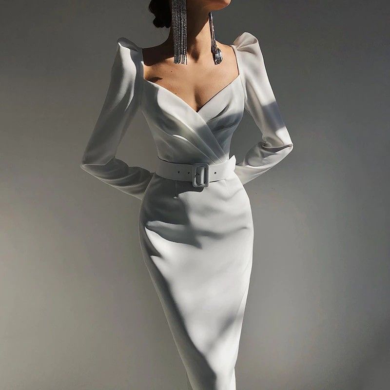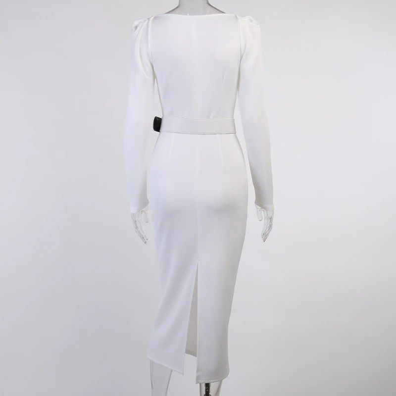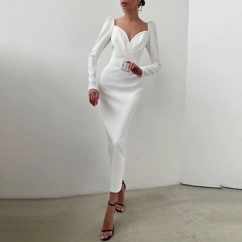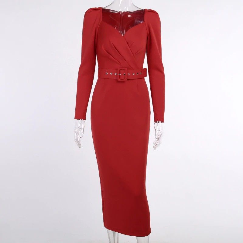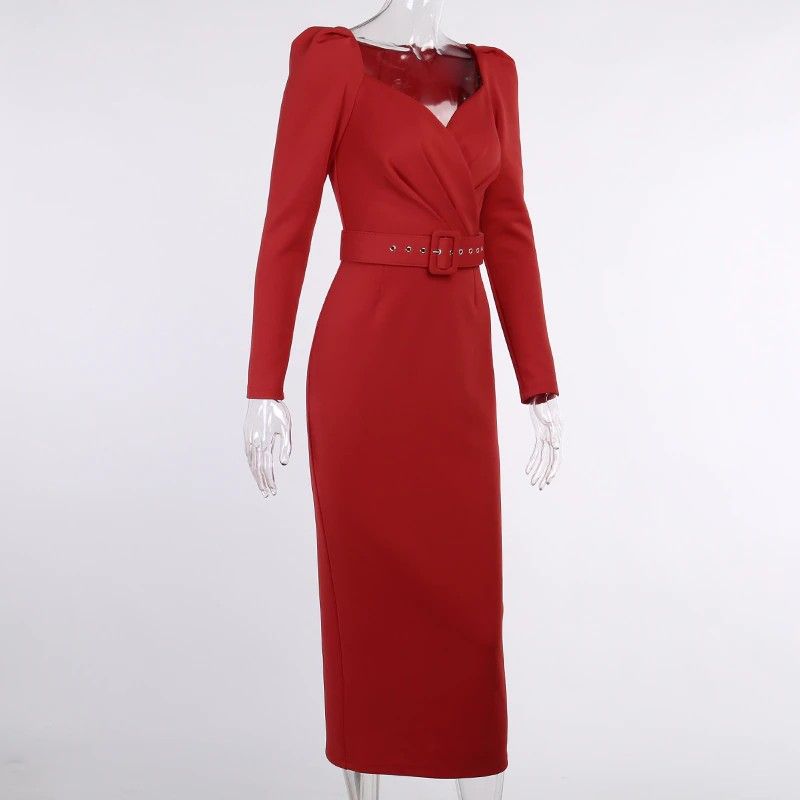Instahot/Элегантные Вечерние Платья Для Женщин, Облегающее Платье-Карандаш До Середины Икры С V-Образным Вырезом И Длинным Рукавом, Повседневные Офисные Женские Однотонные Красные Платья С Пышными Рукавами Последний