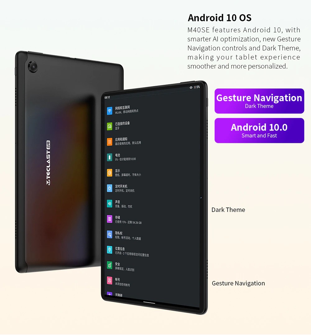 M40SEfeatures Android 10, с Умной оптимизацией AI, новым управлением навигацией жестов и темной темой, что делает ваш планшет более гладким и Персонализированным.