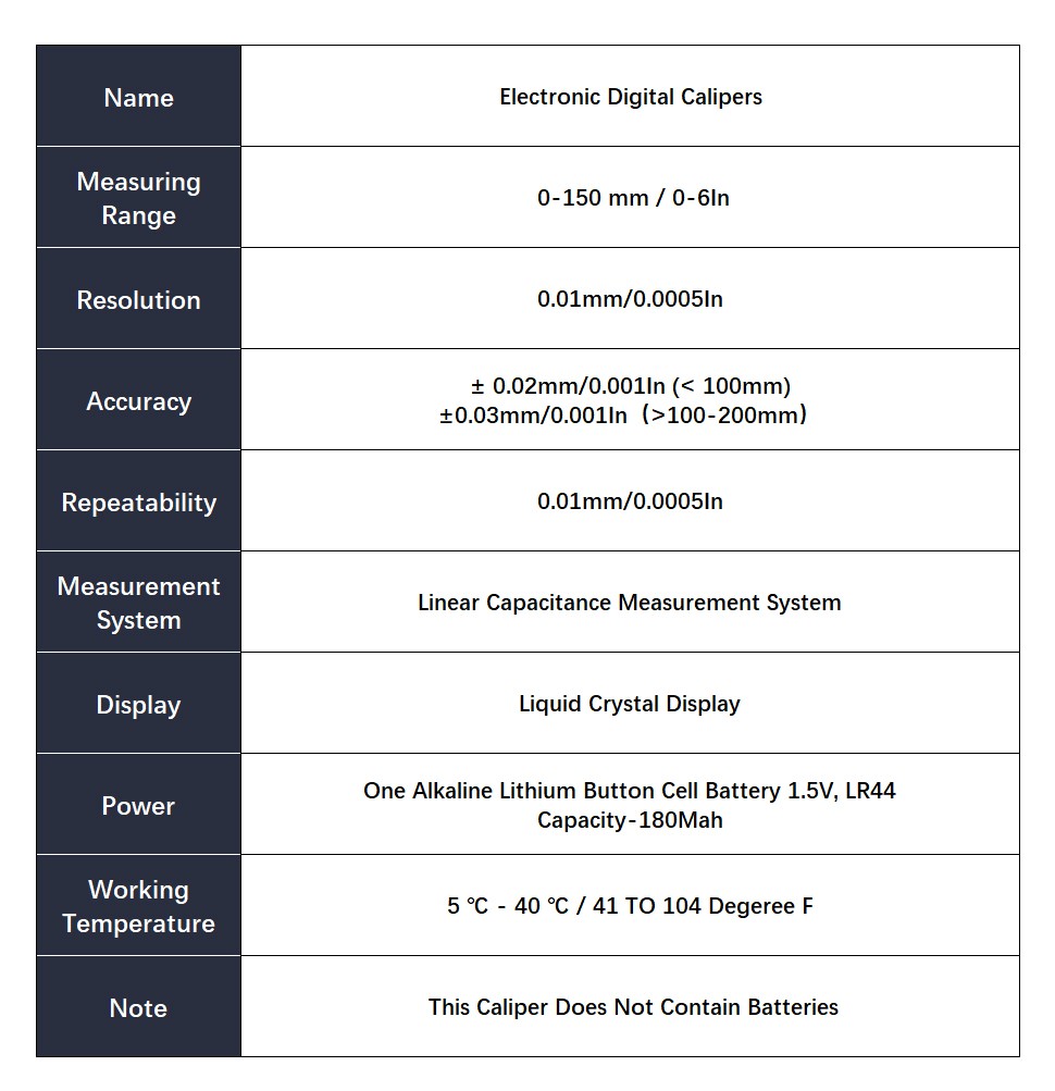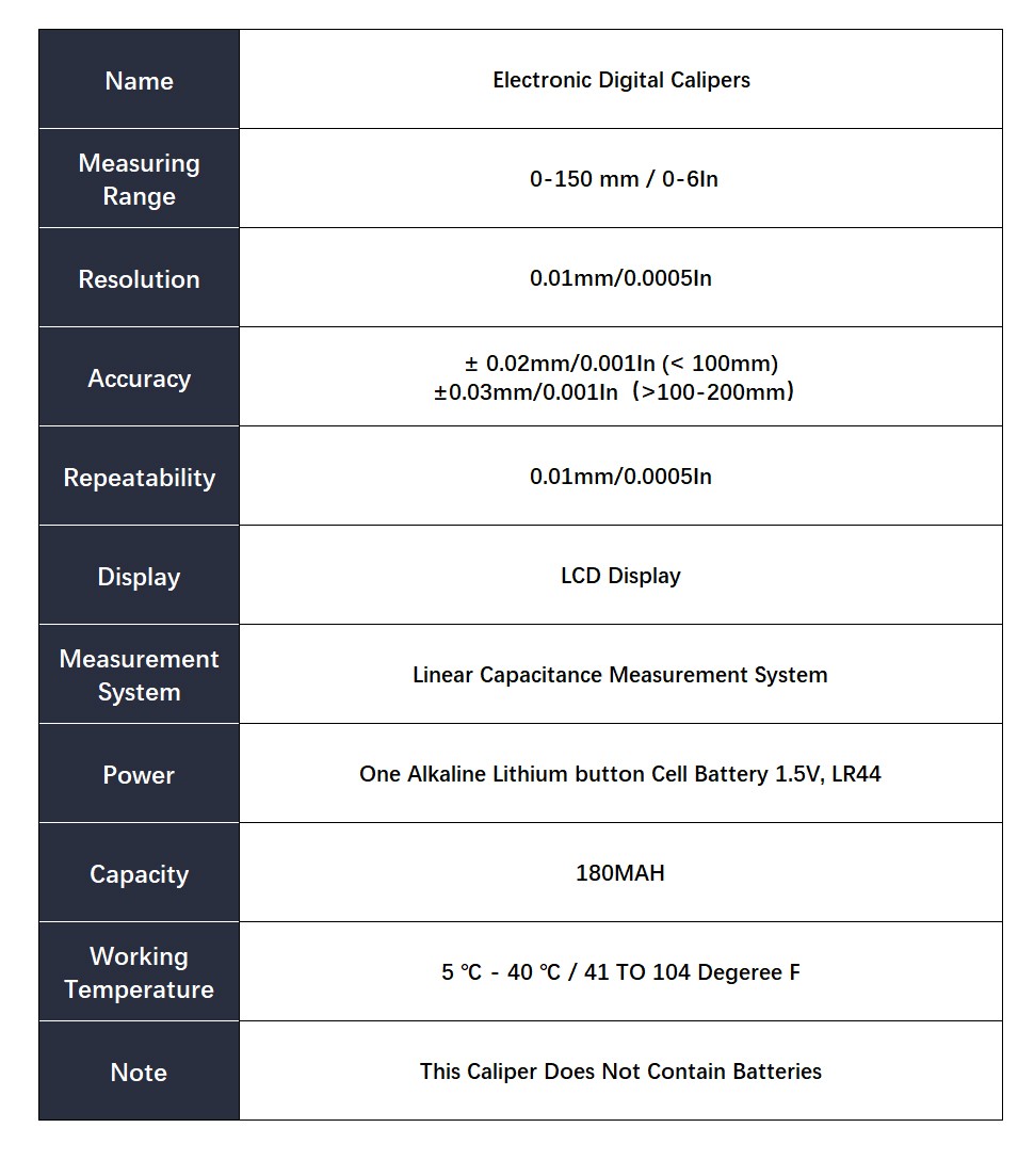 2. Штангенциркули поставляются без батарей, пожалуйста, приобретайте их самостоятельно.