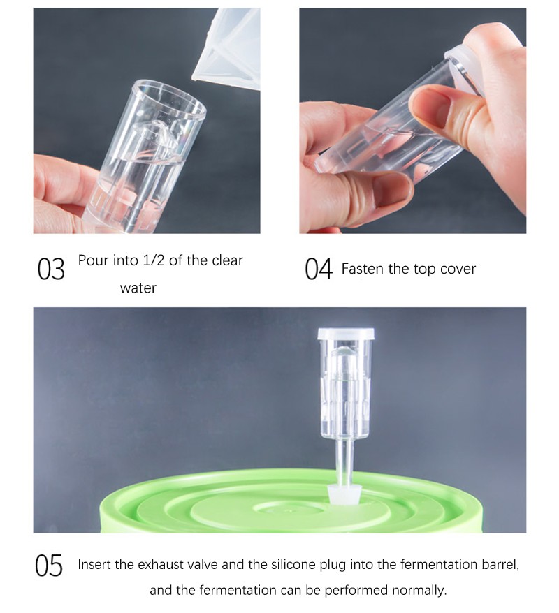 3. Инструкции по использованию: вам просто нужно заполнить воду в выпускной клапан, вставьте его в крышку пивоваренного бочонка или резиновую вилку в верхней части контейнера для брожения, а затем закройте его крышкой.