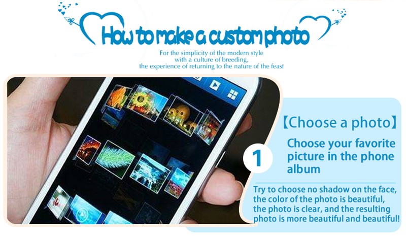 1. 【Выберите фотографию 】 Выберите свою любимую фотографию в альбоме телефона. 2. 【Отправьте фото 】 свяжитесь с нами, отправьте нам выбранную вами картинку и сообщите нам размер. 3. 【Посмотрите на эффективность 】после отправки фотографии, служба поддержки клиентов покажет вам эффект фото дизайна. 4. 【Сделайте заказ 】 разместите заказ для оплаты, выбрав правильный размер. Мы завершим производство в течение 3 дней.