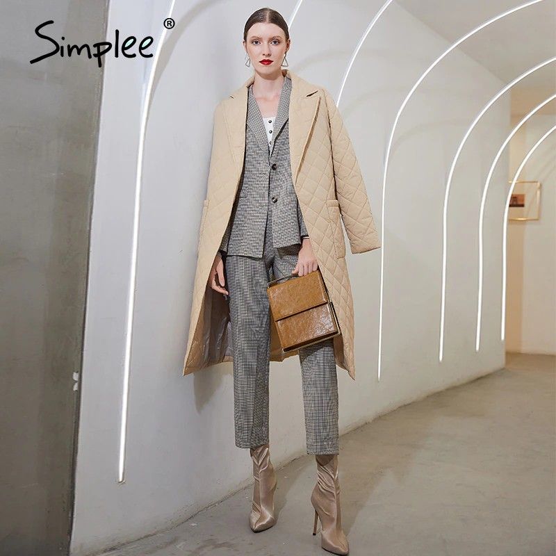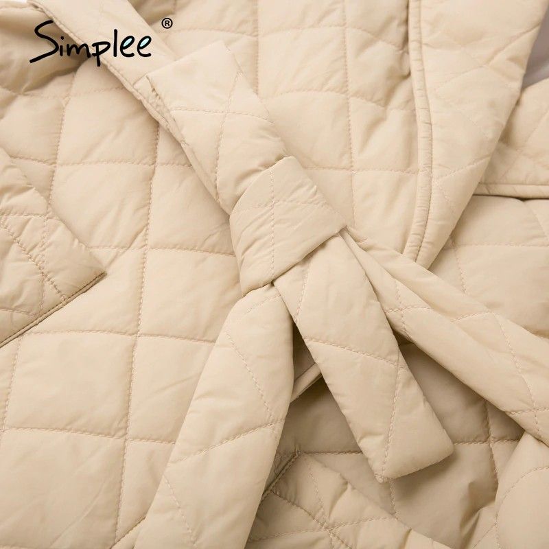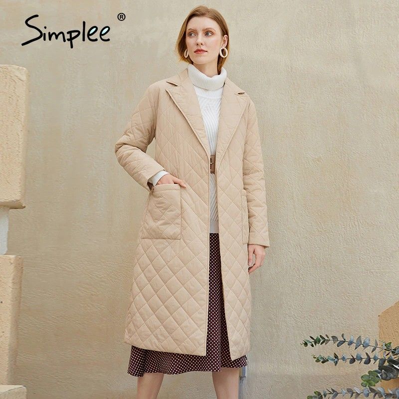 Simplee Длинное Прямое Зимнее Пальто С Ромбовидным Узором, Повседневная Женская Парка С Поясом, С Глубокими Карманами И Воротником, Стильная Верхняя Одежда
