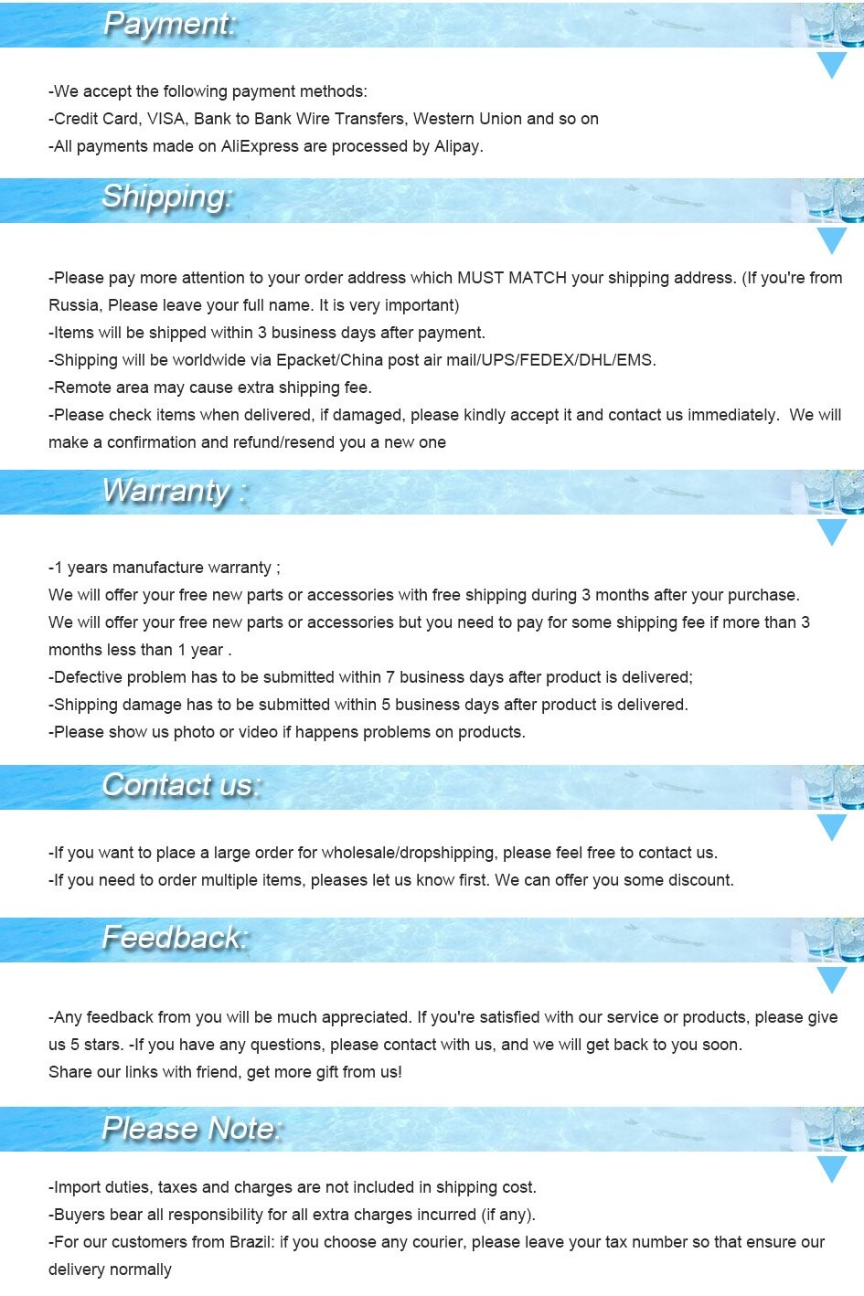В последнее время некоторые клиенты сообщили, что на китайском языке имеется только руководство, но руководство на английском языке отсутствует. Мы глубоко приносим извинения за это, потому что оригинальная посылка только организует руководство на китайском языке. Для решения этой проблемы наш магазин специально перевел руководство на английском языке для вас. Если это удобно для вас, пожалуйста, оставьте свою контактную информацию, и мы вышлем вам электронную версию переведенного руководства на английском языке. Если у вас есть требования к инструкциям на других языках, пожалуйста, свяжитесь с нами, и Мы переведем руководства на нужный вам язык.