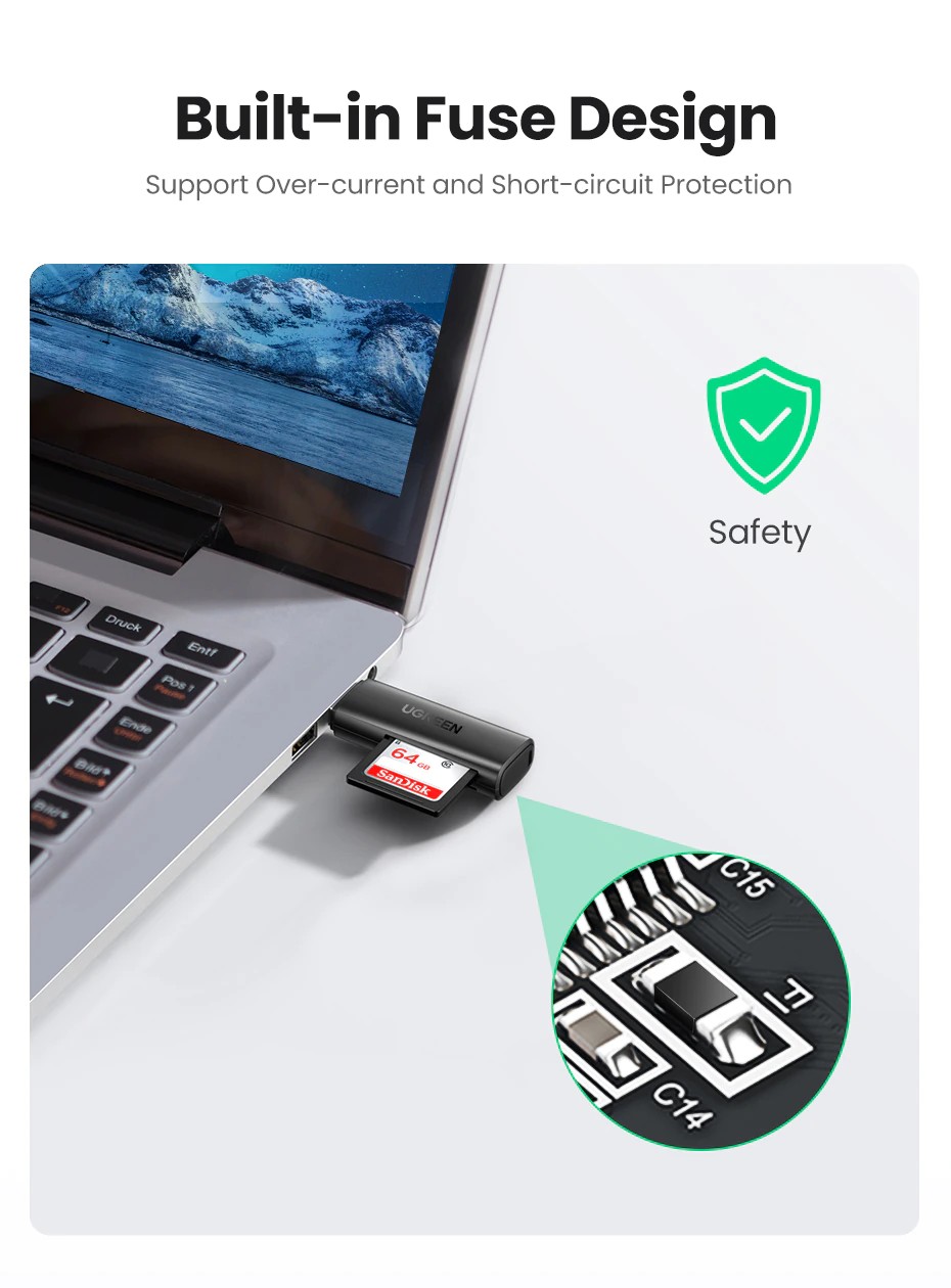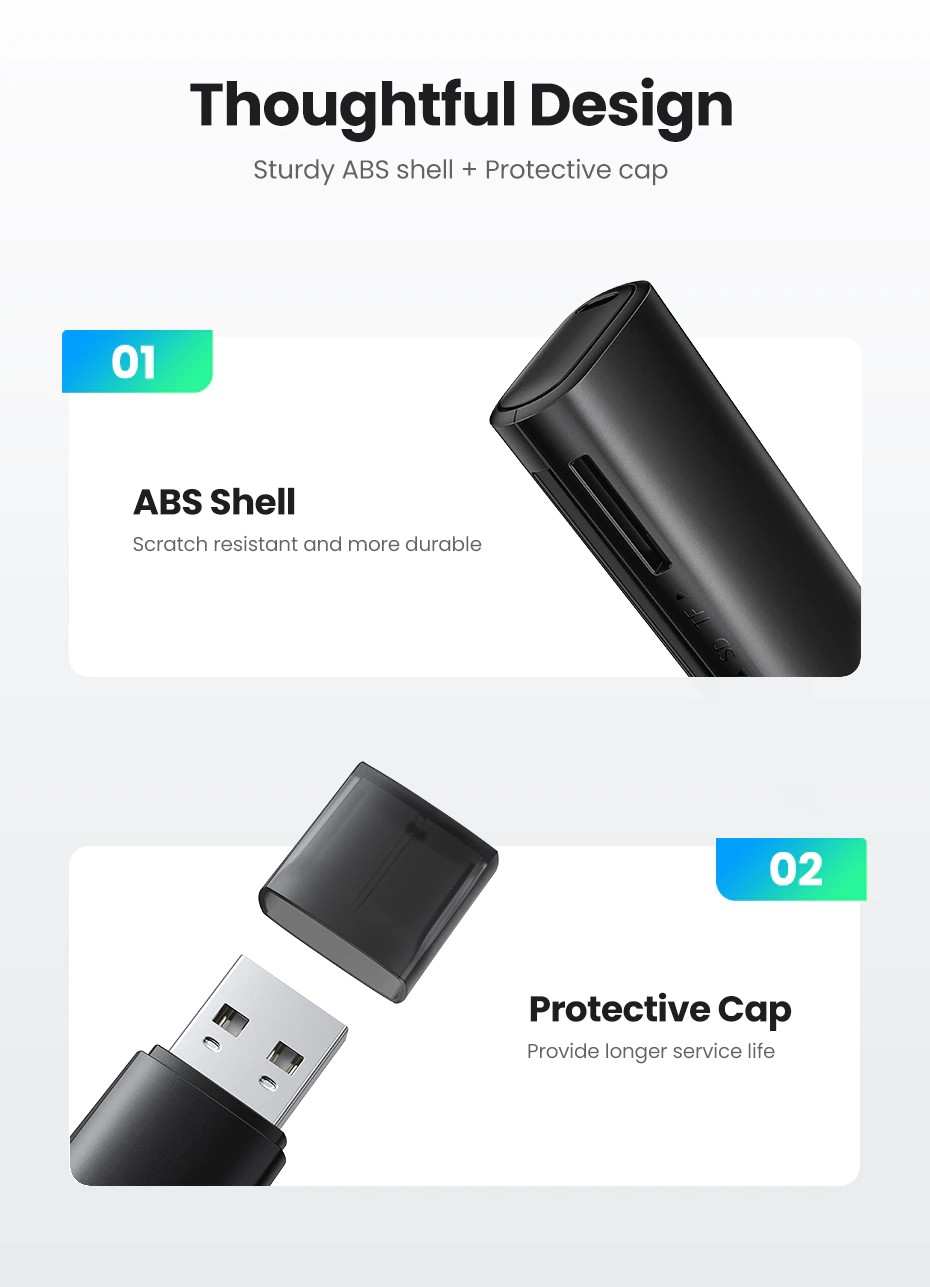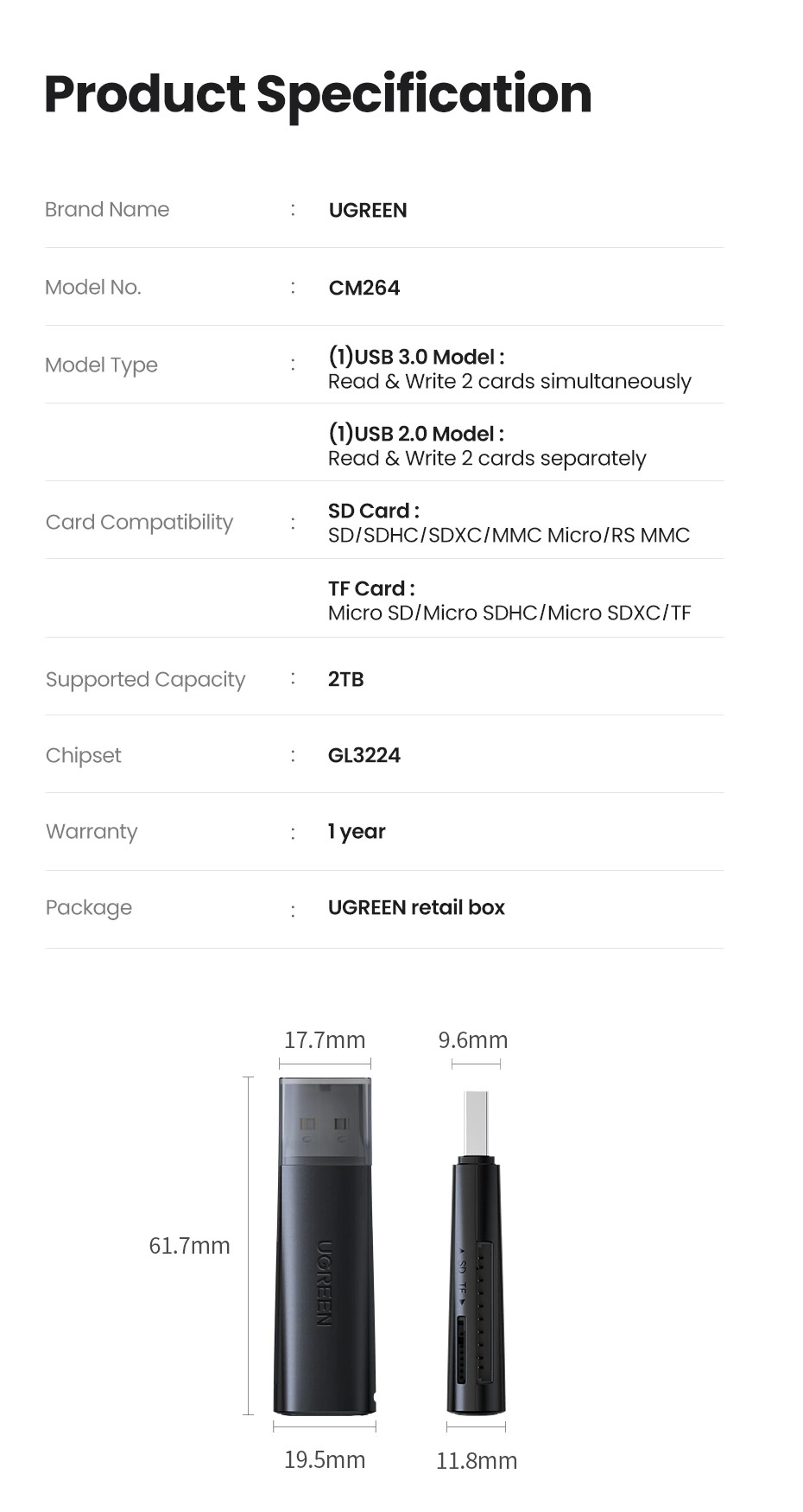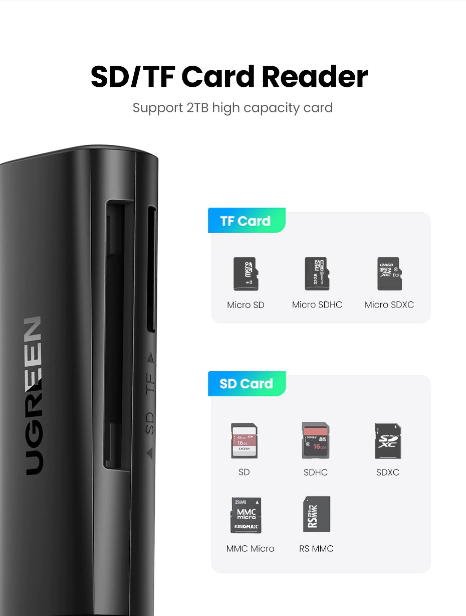 Кардридер UGREEN USB3.0 2-в-1, кардридер SD Micro SD для компьютера, ПК, адаптер для смарт-карт памяти Устройство для чтения карт SD TF
