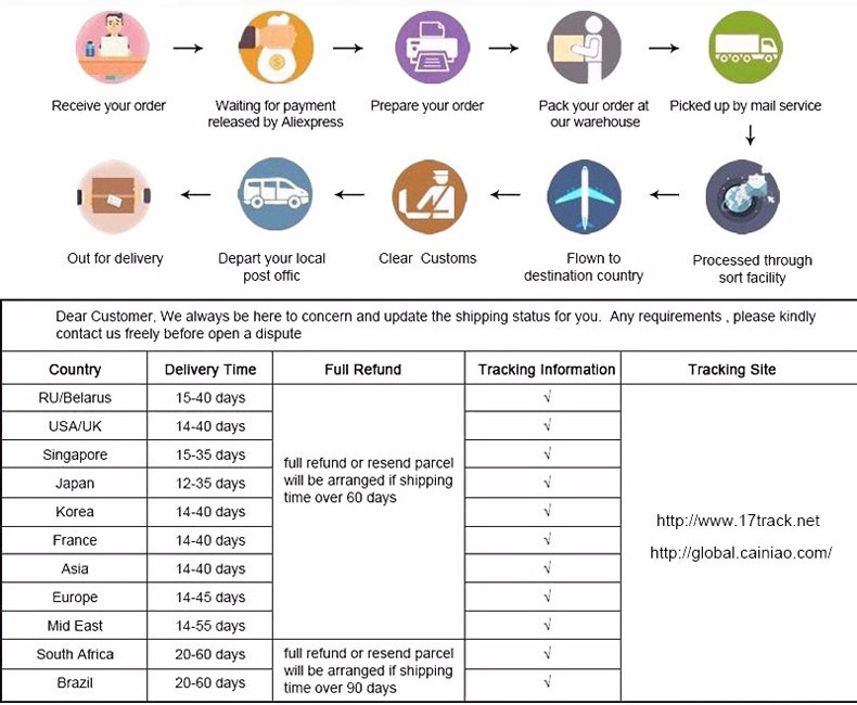Пожалуйста, сначала свяжитесь с нами, мы Отследим ваш товар. Если вы не получили товар, мы полностью вернем Вам деньги или отправим его повторно. Мы честный продавец, поэтому не волнуйтесь.