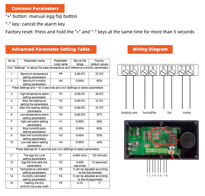 Заводские по умолчанию: температура 37,8, влажность 60% RH, (Примечание: машина уже установила оптимальную температуру и влажность для вылупления, не рекомендуется менять значения параметров самостоятельно)