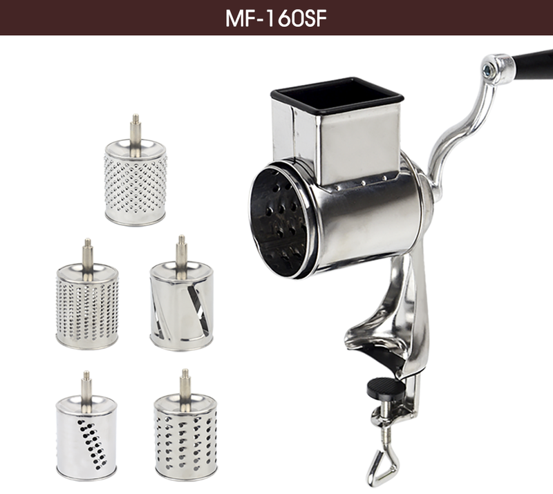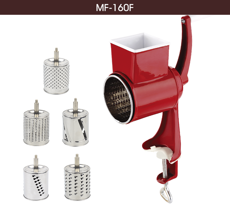 It comes with 5 different drums blades which make the grater to be a multifunction kitchen tool. You can vary the food fineness via use of different blades to grate cheese, vegetables, nuts, etc.