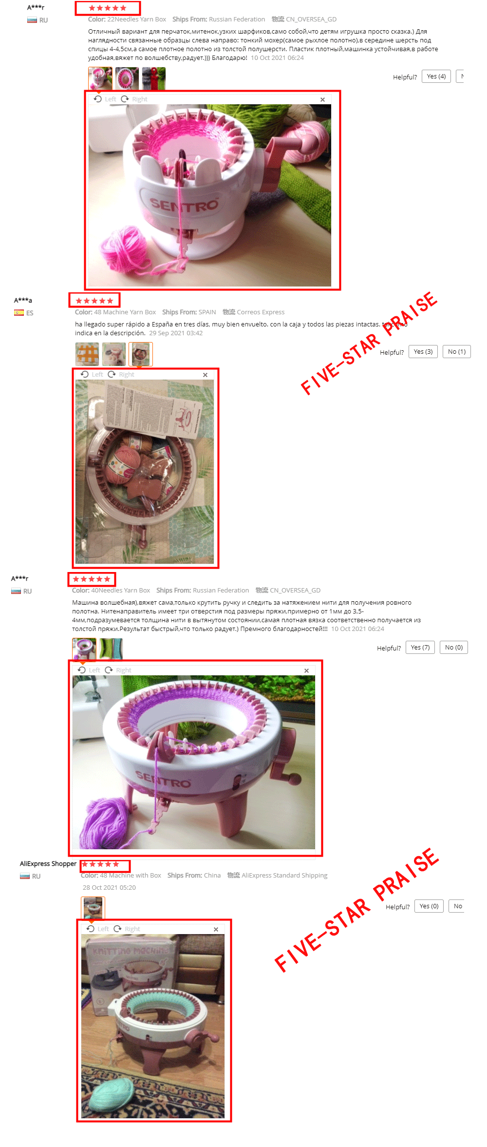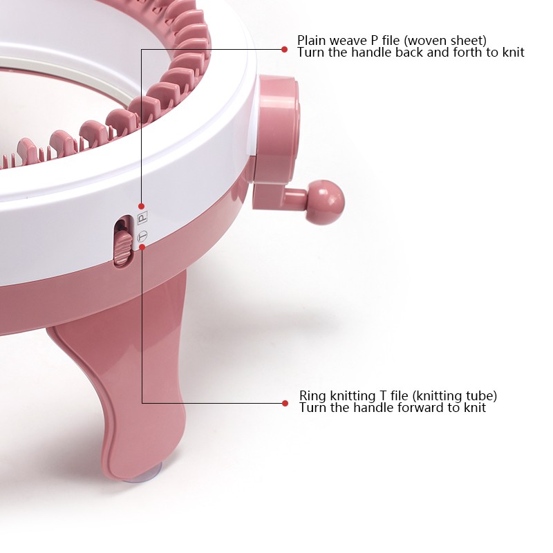 Bu manuel örgü makinesi, çeşitli ihtiyaçları karşılamak için çift moda sahiptir. T döngü örgü, ilk diş sızıntısına döndükten sonra, silindirik bir kumaşa dokunmak için saat yönünde bir dönüş başlatın, bitirdikten sonra şapka olarak kullanılabilir. P düz örgü, ayarlayabilirsiniz genişliği kumaş ihtiyaçlarınıza göre ve kullanın iğne ve tığ işi serbestçe ekleme bir eşarp, vb