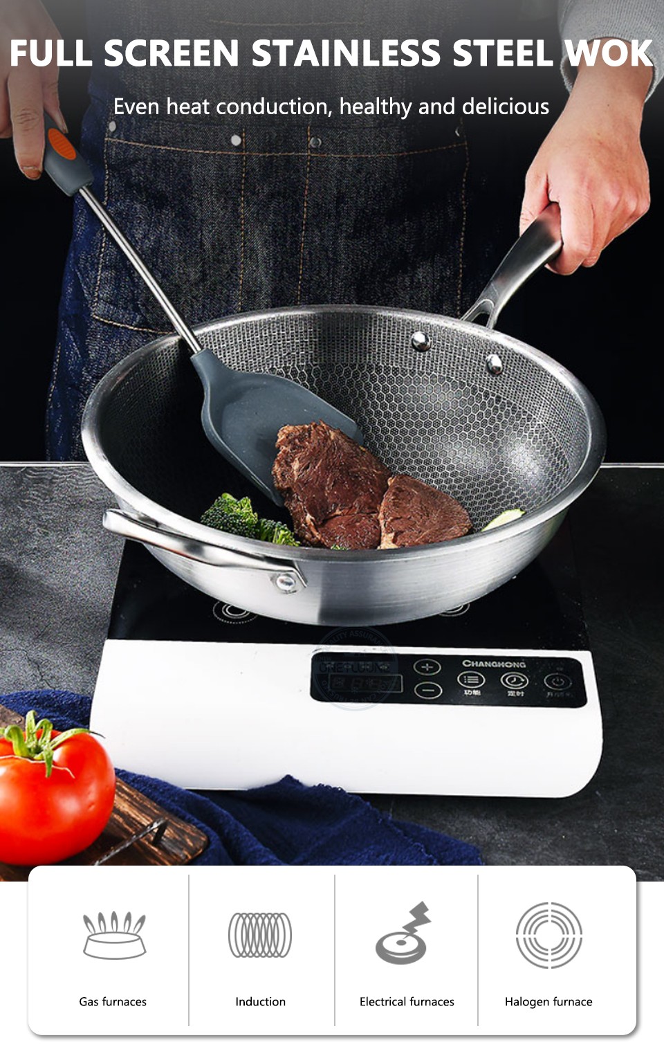 3.7 katlı geleneksel yuvarlak alt wok, gaz veya elektrik aralıklarında karıştırmak için ideal geniş bir pişirme yüzeyine sahiptir. Wok spatula wok yüzeyini çizmez.
