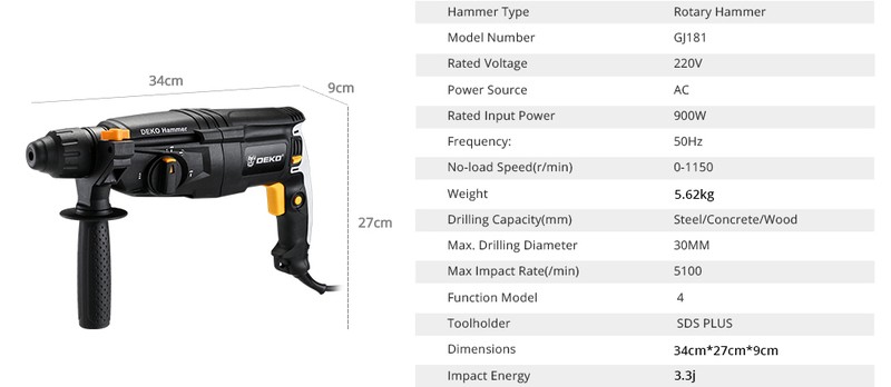 Deko Dkrh26H2/Dkrh20H3 Çok Fonksiyonlu Döner Çekiç Bmc Ve 6 Adet Aksesuarları Elektrikli Yıkım Çekiç Darbeli Matkap