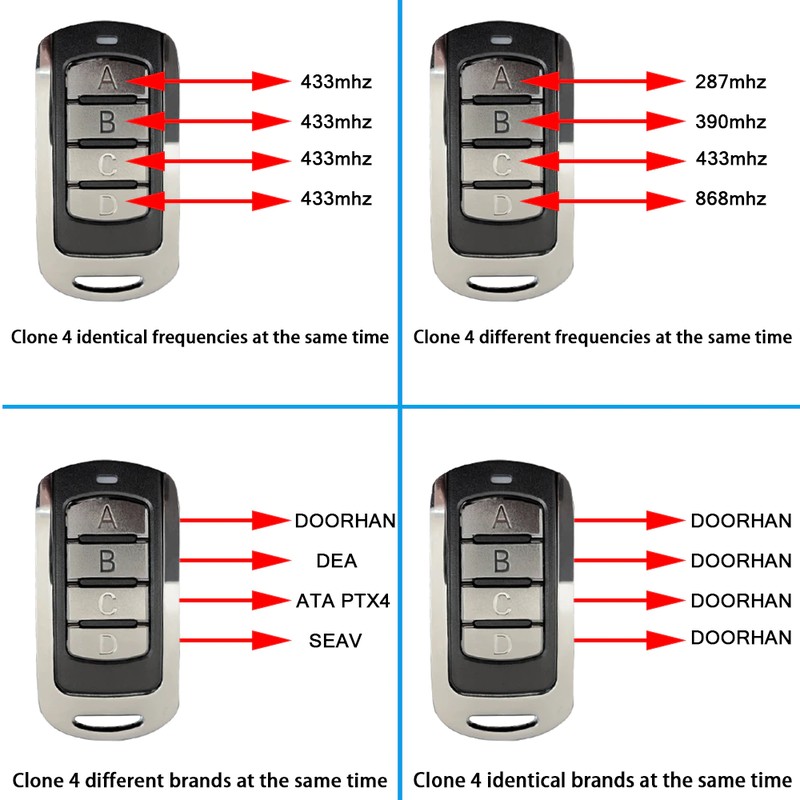 4 in 1: aynı marka ve frekansın 4 uzaktan kumandası ile aynı anda uyumludur ve aynı anda farklı markaların ve farklı frekansların 4 uzaktan kumandası ile uyumludur. İlgili düğmeleri kendi alışkanlıklarınıza göre ayarlayabilirsiniz.