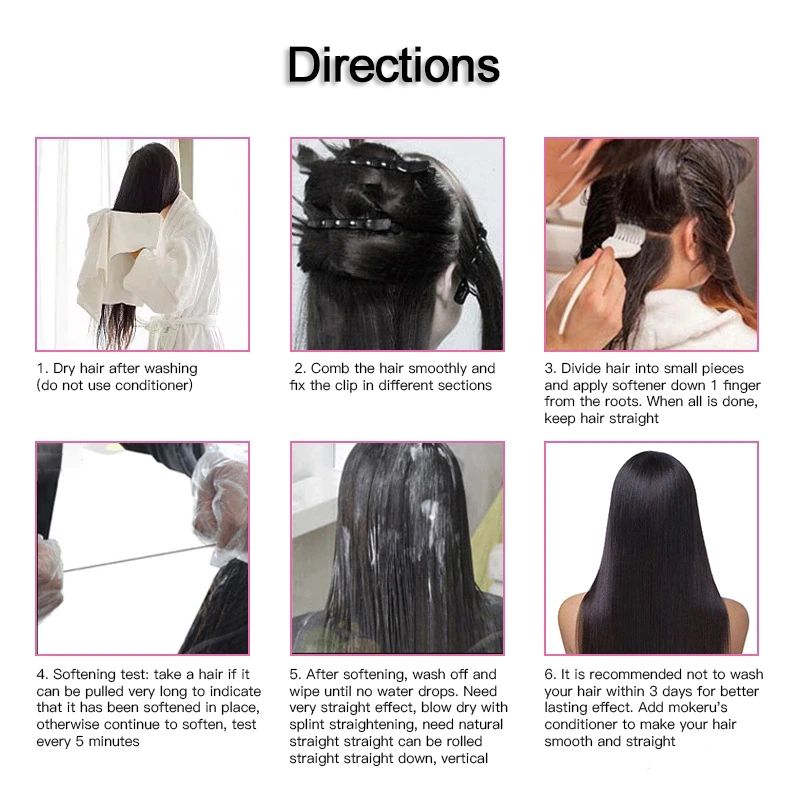 Ürün saçta eşit olarak çözünür, aynı zamanda saçlarınızı saç kuyruğunda tutun, saçları düzleştirin. about5-8 dakika sonra saçları kuru saçtan daha temiz suyla yıkayın. Saç düzleştirme, yumuşatma ve pürüzsüz olacak.
