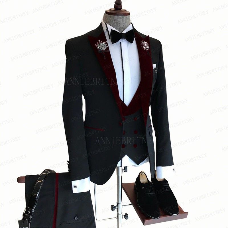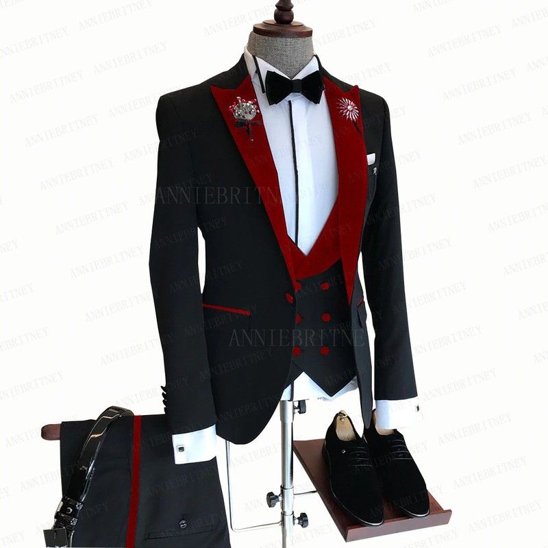 en yeni Resmi Iş Erkek Takım Elbise 3 Adet Erkek Ceket Özel Moda Damat Düğün Takım elbise sigara Kırmızı Kadife Yaka Blazer Yelek Pantolon