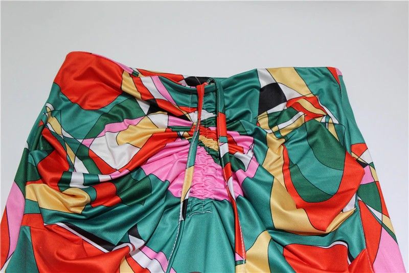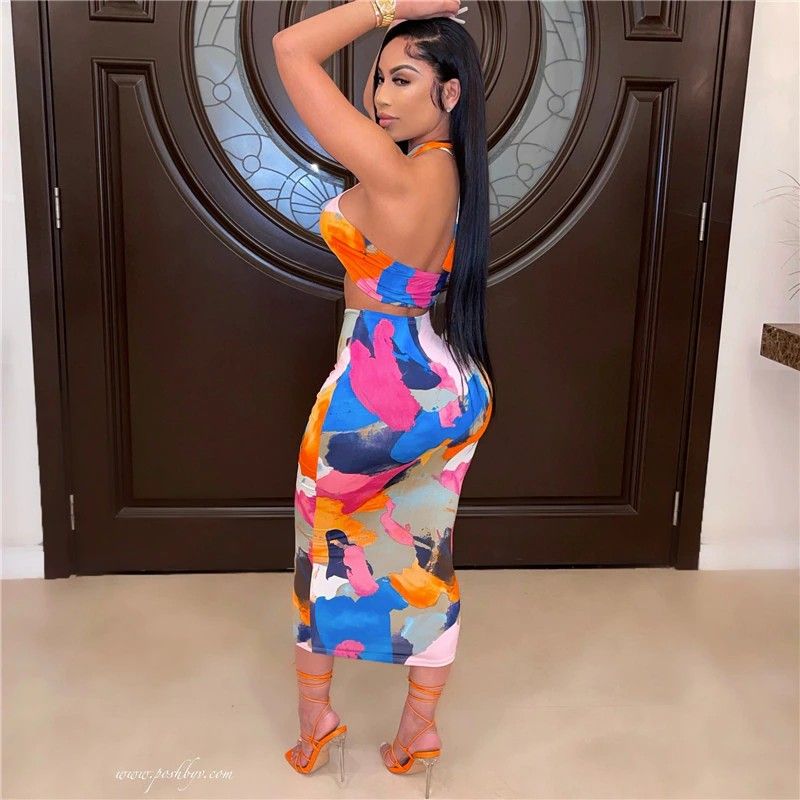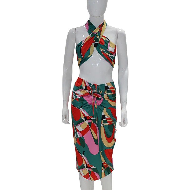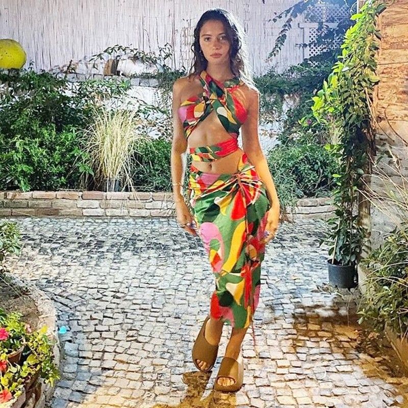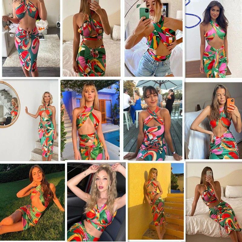 en yeni Seksi Baskı Eşofman Kadın Iki Parçalı Boho Kıyafet Takım elbise Halter Bandaj Tankları Ve Dantelli İpli Midi Etekler Eşleşen Setleri