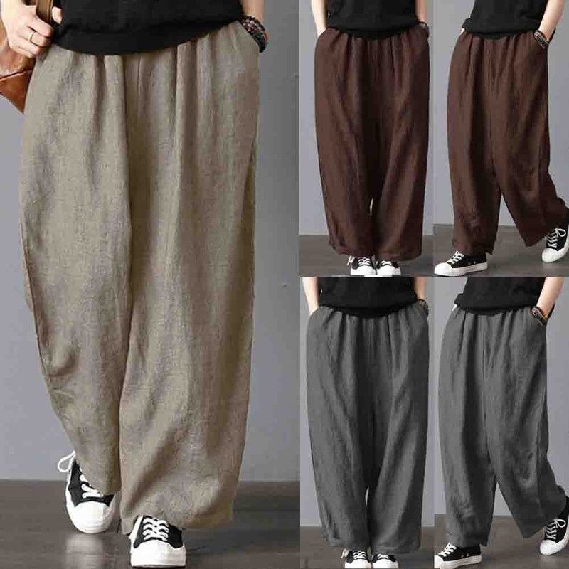 Artı Boyutu Erkek Pantolon Pamuk Keten Geniş Bacak Harem Pantolon Gevşek Rahat Moda Eğlence Tatil Plaj Kargo Pantolon
