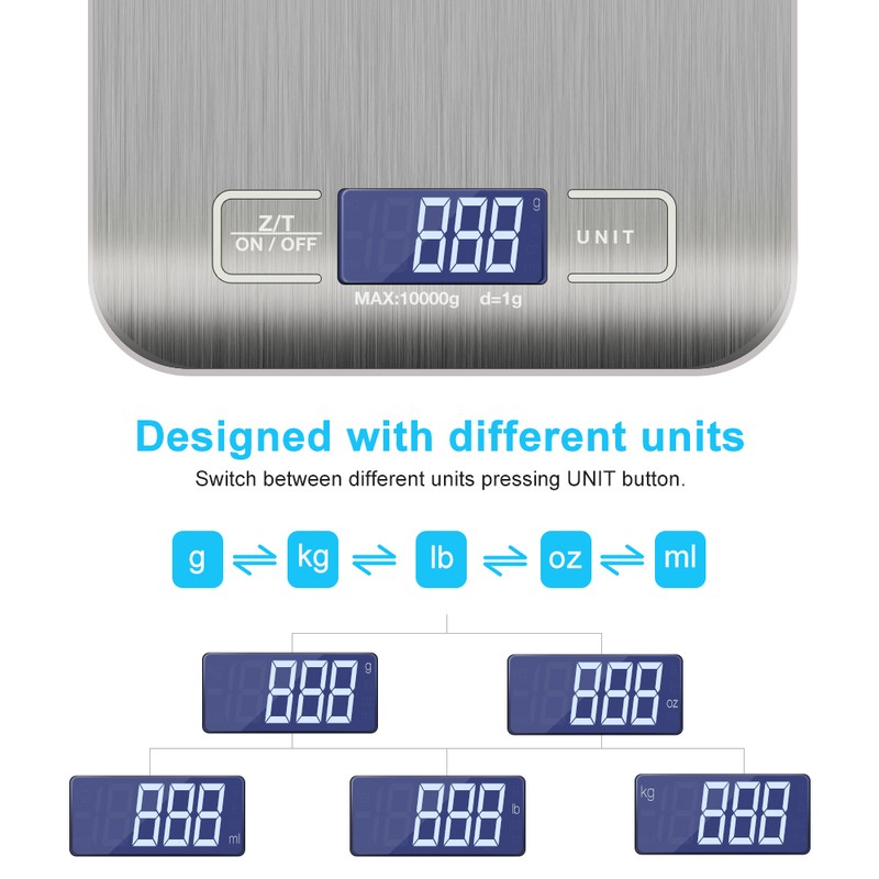 Mutfak terazisi paslanmaz çelik yüzey ve ABS korozyona dayanıklı plastikten yapılmıştır. Su geçirmez ve kir-dayanıklı, kullanımı kolay. Dijital ölçek, un, meyve, donanım, çin tıbbı, mücevher vb. Tartmak için kullanılan ev ve mutfak için uygundur. Farklı senaryolar için uygun güçlü işlevsellik. Aile işi için iyi bir yardımcıdır.