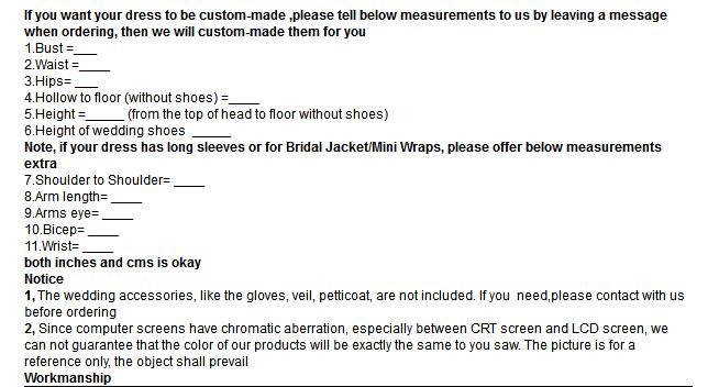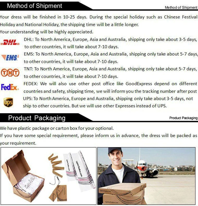 Memnuniyetiniz bizim için en büyük öneme sahiptir. Paketinizin gelişi üzerine, elbisenin belirttiğiniz standart boyuta veya özel ölçümlere yapıldığından emin olmanızı ve kontrol etmenizi öneririz. Etiketleri çıkarmadan, değiştirmeden veya elbiseyi yıkamadan elbisenizi mümkün olan en kısa sürede deneyin.