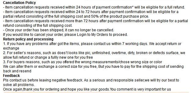 -Ödeme onayının 24 saat içinde alınan ürün iptali talepleri * tam bir geri ödeme için uygun olacaktır.