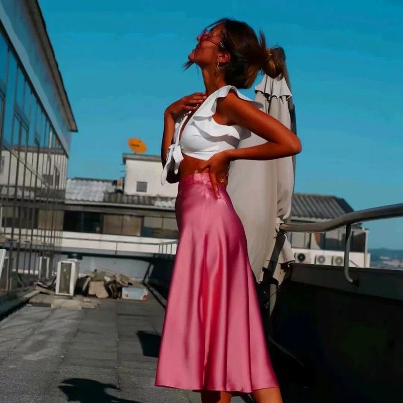 Ince Kadın Pembe Saten Etekler Bayanlar Için en yeni Sarı Sıska Kalem Etek Kızlar Zarif Parti Pürüzsüz Giyim Jupe Femme Faldas