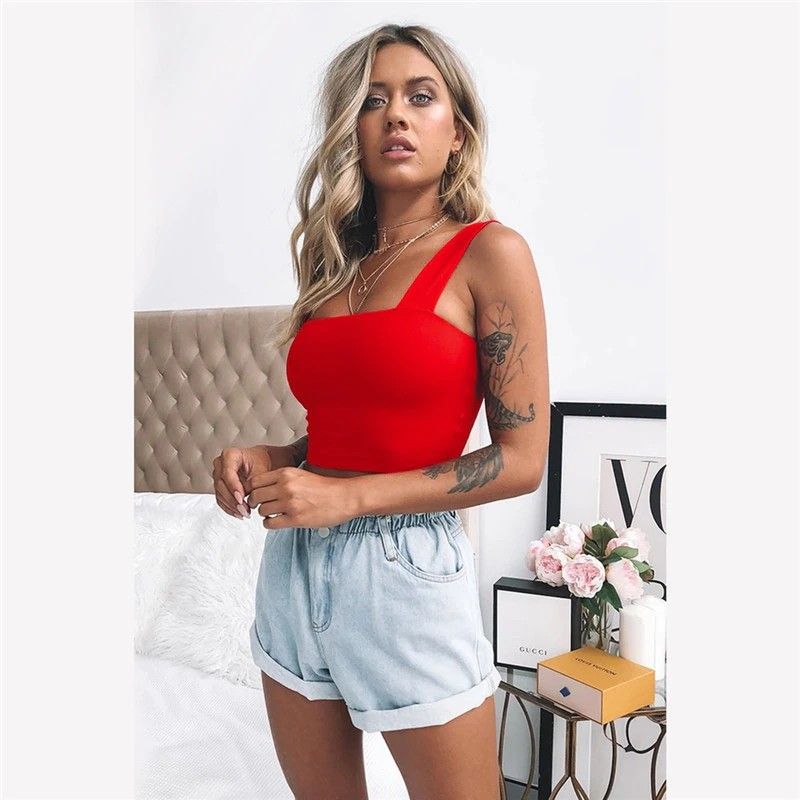 Kare Boyun Kolsuz Yaz Kırpma Üst Beyaz Kadınlar Siyah Casual Temel T Shirt Kapalı Omuz Cami Seksi Backless Tank Top