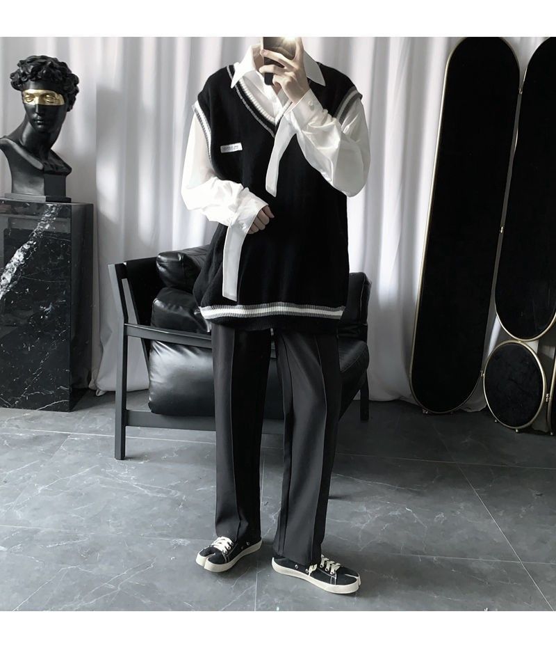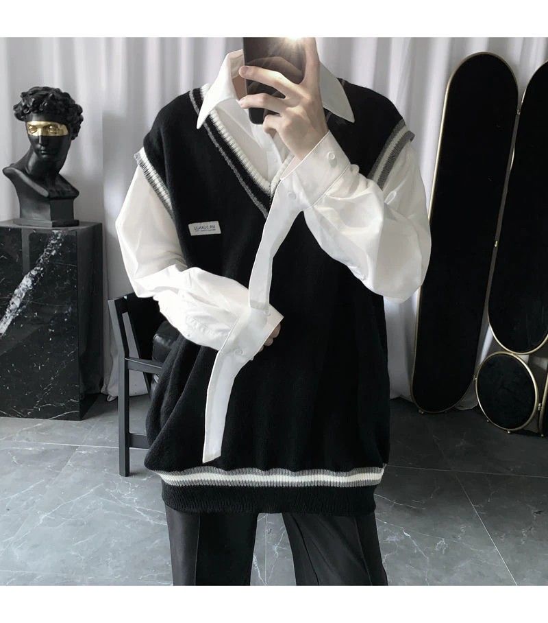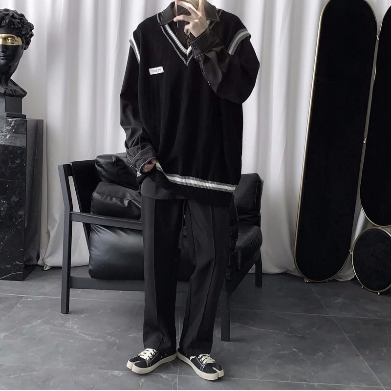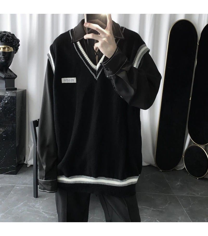 Kazak Yelek Erkek V Yaka Patchwork Eğlence Gevşek Tüm Maç Streetwear Kolsuz Kazak Erkek Şık Kore Tarzı Gençler Çiftler Bf