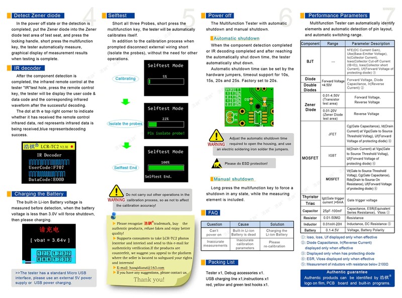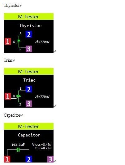 T7 / TC1:Renkli ekran, iki fonksiyon aynıdır! T7 biraz daha hızlı! TC1 ekranı biraz daha büyüktür ve hepsi lityum pillerle çalışır. Direnç, kapasitans, endüktans, diyotlar, MOS transistörler, tristörler ölçmenin yanı sıra, ek voltaj regülatörleri, kızılötesi kod çözme (Hitachi formatı ile sınırlı) ölçebilir
