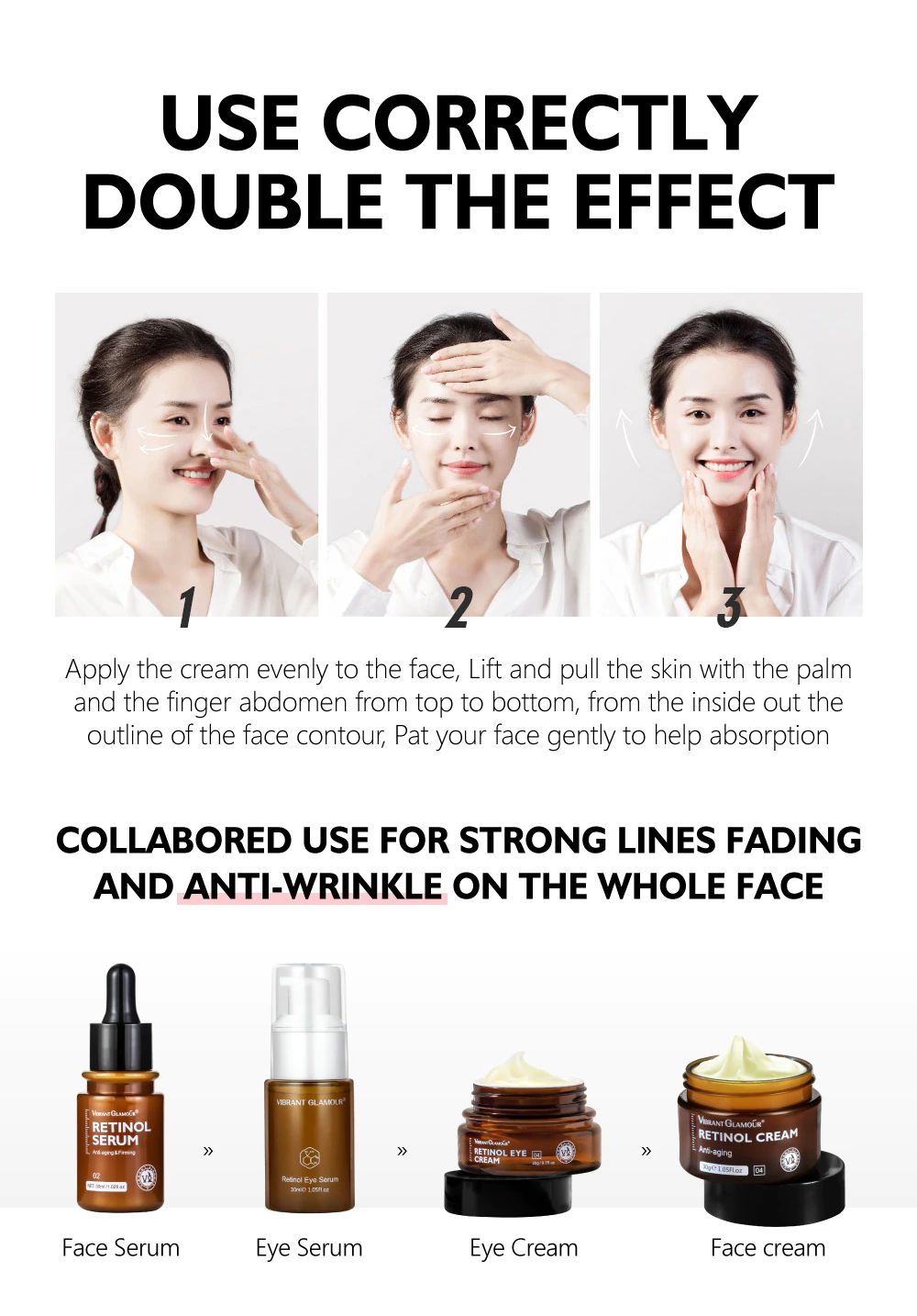 Laboratory studies have shown that: Double Retinol(Vitamin A)+Vitamin C+Acetyl Hexapeptide-8+Arbutin,strength of anti-wrinkle fade wrinkles, brighten the skin tone