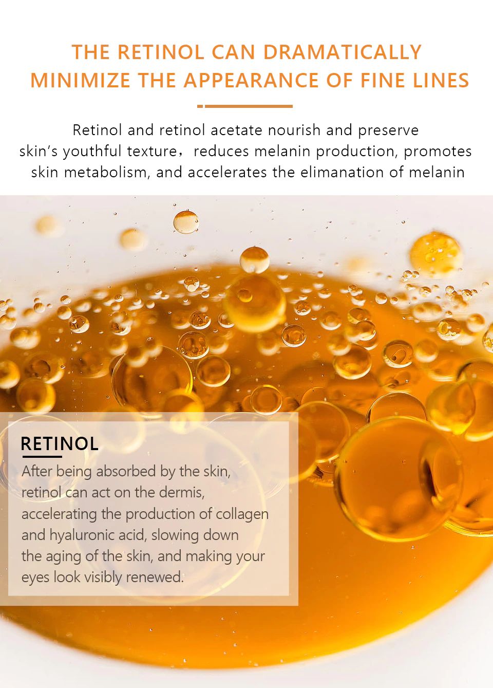 EFFICAC Y: Acquoso sensazione e liscia come la seta texture, in combinazione con amino-propanolo ascorbate fosfato ester e polipeptide attività, estratto di Aggiungere strati di sostanze nutritive per la pelle, equilibrio di umidità della pelle e olio, Con Retinolo retinyl estere Profondamente nutre e riempie la pelle, Migliorare la viso linee sottili, ottusità, secchezza e altri problemi della pelle, Ringiovanire la pelle con fermezza e birght giovanile e idratante Guardare