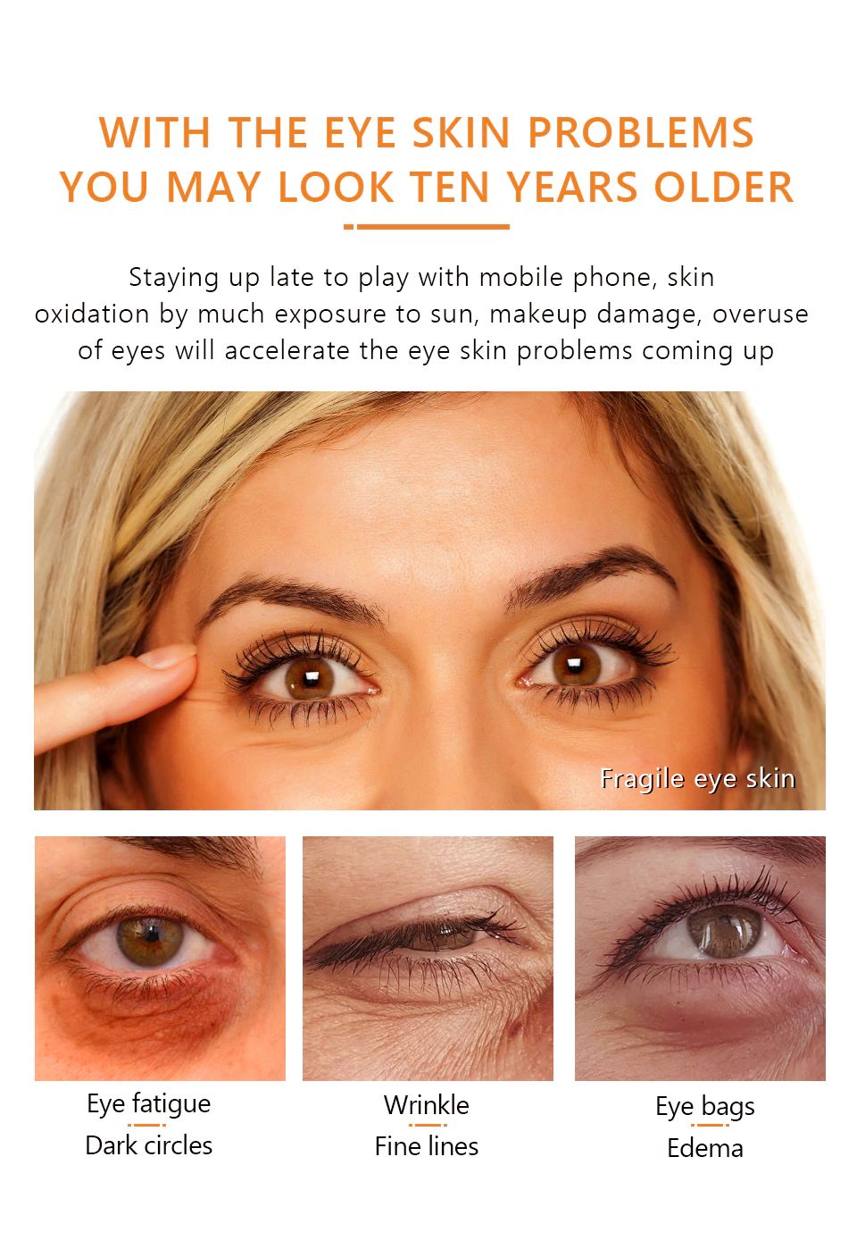 Rimanere alzati fino a tardi per giocare con il telefono cellulare, ossidazione della pelle da esposizione al sole, trucco danni, overuseof gli occhi saranno accelerare i problemi della pelle degli occhi in arrivo